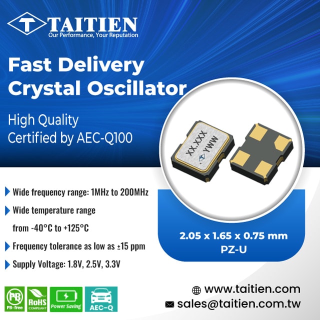 Taitien's PZ-U Type crystal oscillator, compact in size with dimensions of only 2.05 x 1.65 x 0.75 mm, boasts a wide frequency range, from the minimum 1MHz to a maximum of 200MHz. As a representative product of the FASTXO series, it is designed to meet the requirements of a variety of digital applications in the market. The PZ-U not only holds AEC-Q100 certification but is also manufactured under the stringent IATF 16949 quality system, with support for VDA 6.3 auditing, assuring its quality. With PPAP document support, it satisfies all automotive electronic industry requirements. Any frequency, rapid delivery - reducing both the customer's product development and time to market.Product Feature
